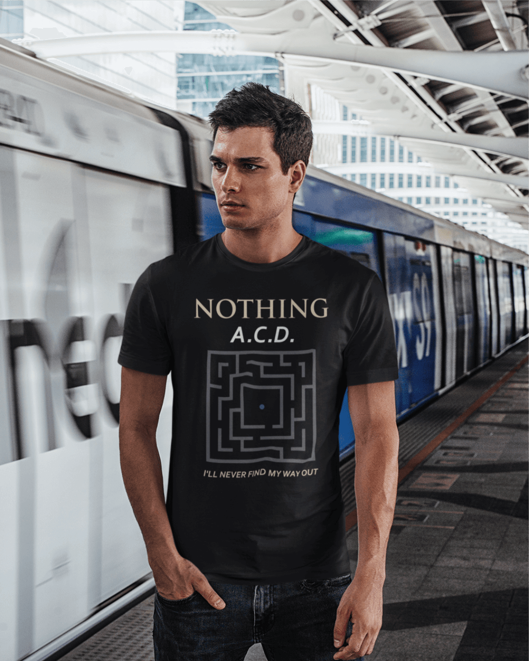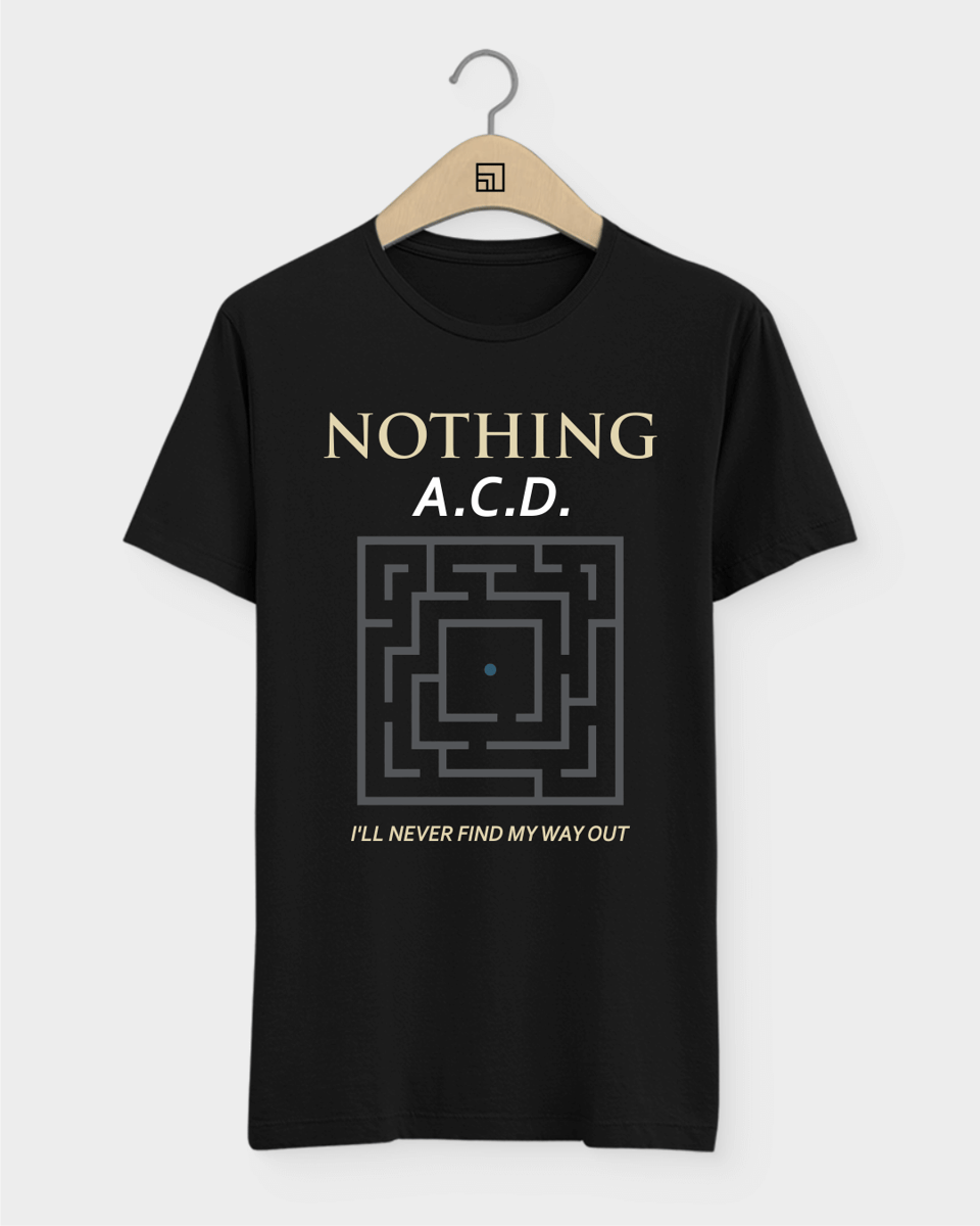 Camiseta Nothing “A.C.D.” — silêncio e labirinto visual no estilo shoegaze minimalista. Edição limitada da coleção Shoegaze in Silence.