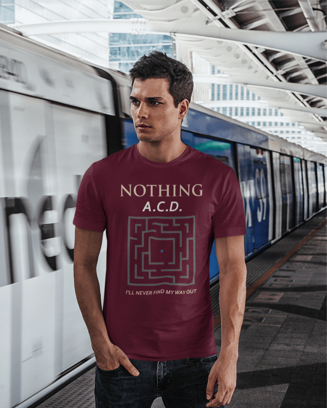 Camiseta Nothing “A.C.D.” — silêncio e labirinto visual no estilo shoegaze minimalista. Edição limitada da coleção Shoegaze in Silence.